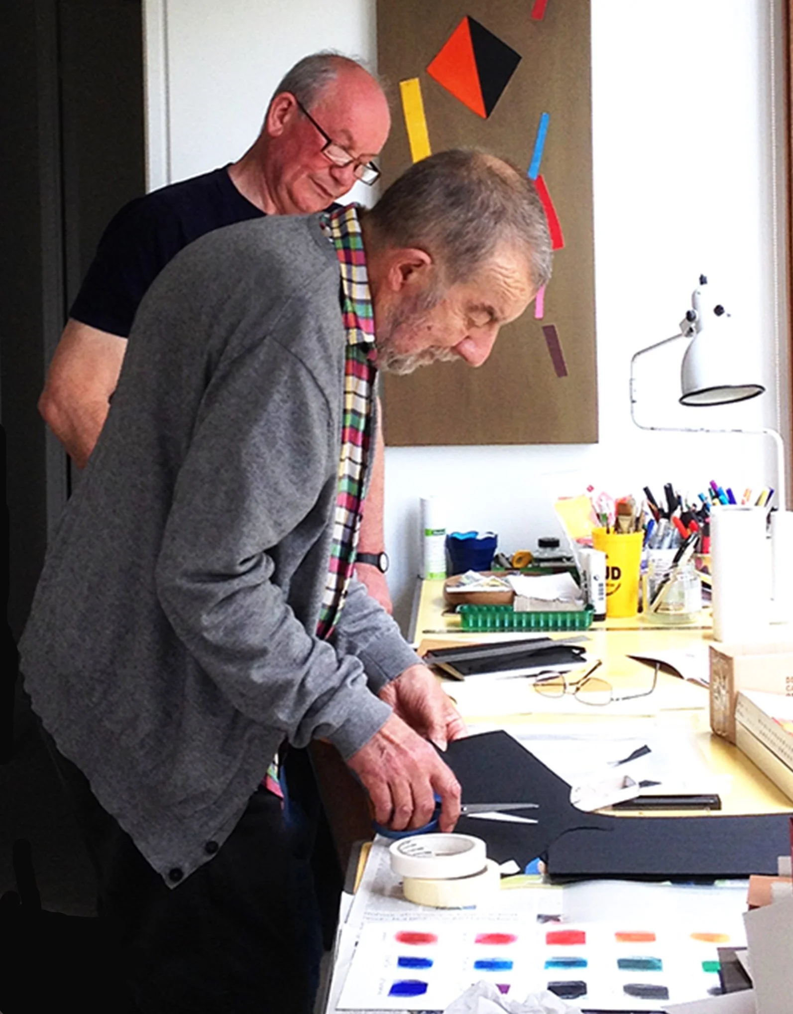 There are two basic layers [to each print]; the black is the etching that was drawn onto the True Grain – drawn with dilute gouache, Indian ink, wax pastel, graphite stick… all kinds of things. It goes from the finest, lightest, smokiest tone through to a full black, all printed on the same plate. Then the next bit is the colour - John cut the sheets of etching inks up because he could still handle scissors and a knife and positioned the shapes of colour where he wanted them. I then, literally, used the paper that he cut to make a mask to create a further photo etching plate and then they’re printed ‘a la poupee’. A la poupee means ‘by the dolly’ and a poupee is one of the French dollies with a skirt. If you roll up a piece of felt, into a cigar like shape, you can ink one part, then wipe it back with scrim and then tissue, then move onto the next colour. Each of those coloured shaped with inked individually… and you have to be very precise! The scrap rate on these was very very high!