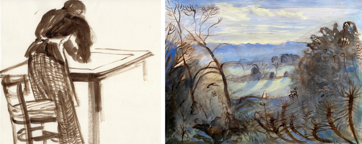 Agnes Treherne: Mother at her Desk, walnut ink (left), View from the Veg Patch, walnut ink and gouache (right)